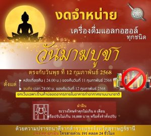 ประชาสัมพันธ์ วันมาฆบูชา งดจำหน่ายเครื่องดื่มเเอลกอฮอล์ทุกชนิด
