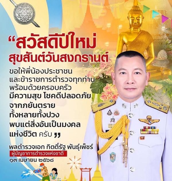 “ สวัสดีปีใหม่ สุขสันต์วันสงกรานต์ ขอให้พี่น้องประชาชนและข้าราชการตำรวจทุกท่าน พร้อมด้วยครอบครัว มีความสุข โชคดีปลอดภัยจากภยันตรายทั้งหลายทั้งปวง พบแต่สิ่งอันเป็นมงคลแห่งชีวิต ครับ ”