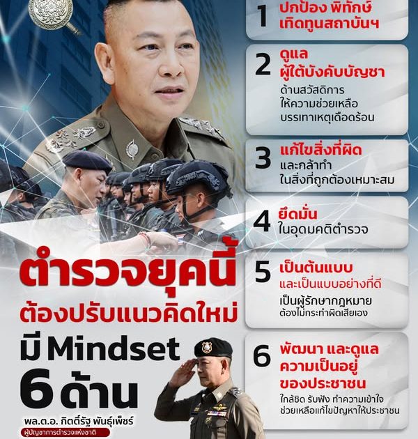พล.ต.อ.กิตติ์รัฐ พันธุ์เพ็ชร์ ผู้บัญชาการตำรวจแห่งชาติ ( ผบ.ตร. ) กำชับในการประชุมบริหารสำนักงานตำรวจแห่งชาติ เมื่อสัปดาห์ที่ผ่านมา เน้นย้ำการปรับแนวความคิด โดยตำรวจต้องมี Mindset 6 ด้าน