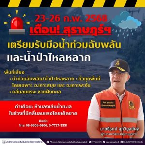 กองอำนวยการป้องกันและบรรเทาสาธารณภัยจังหวัดสุราษฎร์ธานี (ปภ.จังหวัด) ออกประกาศเตือนประชาชนให้เตรียมพร้อมรับมือสถานการณ์น้ำท่วมฉับพลัน น้ำป่าไหลหลาก น้ำท่วมขัง และคลื่นลมแรง ระหว่างวันที่ 23-26 กุมภาพันธ์ 2568 โดยเฉพาะในพื้นที่อำเภอเกาะสมุยและอำเภอเกาะพะงัน ซึ่งอาจได้รับผลกระทบหนักในวันที่ 24 กุมภาพันธ์ ตามประกาศของกรมป้องกันและบรรเทาสาธารณภัยกลาง (ปภ.กลาง) ที่ระบุว่าภาคใต้จะมีฝนตกหนักถึงหนักมากในช่วงเวลาดังกล่าว
