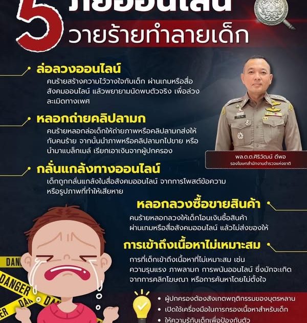 สำนักงานตำรวจแห่งชาติ จึงขอเตือนภัยพี่น้องประชาชน โดยเฉพาะพ่อแม่ผู้ปกครอง ที่มีบุตรหลานอยู่ในความดูแล ให้หมั่นตรวจสอบ และระมัดระวังบุตรหลานของท่าน ไม่ให้ตกเป็นเหยื่อของภัยออนไลน์ ที่มีเป้าหมายหลักเป็นเด็กและเยาวชน ดังต่อไปนี้