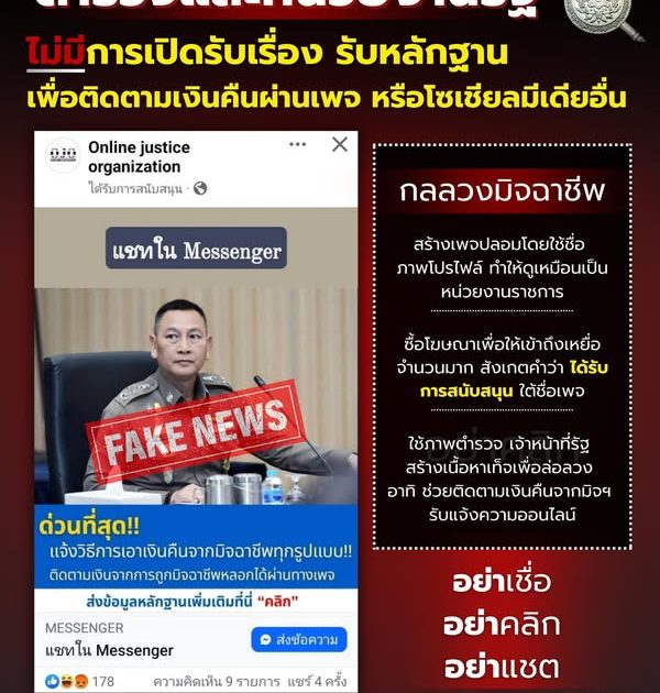 ตำรวจและหน่วยงานรัฐ ไม่มีการเปิดรับเรื่อง รับหลักฐานเพื่อติดตามเงินคืนผ่านเพจ หรือโซเชียลมีเดียอื่น ๆ