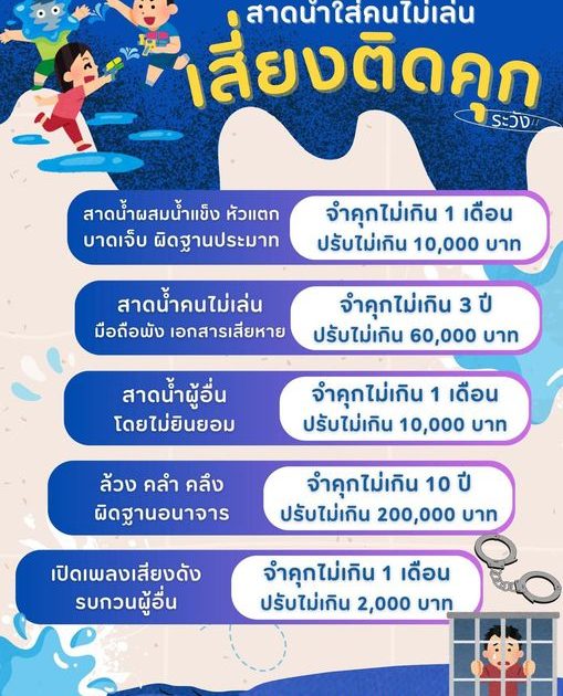 เตือนคนเล่นน้ำสงกรานต์ สาดใส่คนไม่ยินยอมพร้อมใจ ทำทรัพย์สินเสียหาย ได้รับบาดเจ็บ มีความผิดตามกฎหมาย ส่วนใครเปิดเพลงเสียงดังมีโทษจำคุกไม่เกิน 1 เดือน ปรับไม่เกิน 2,000 บาท โดยระบุว่า