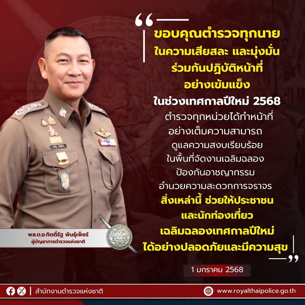 ผู้บัญชาการตำรวจแห่งชาติขอบคุณตำรวจทั่วประเทศ ดูแลความปลอดภัยช่วงปีใหม่ 2568 พร้อมย้ำความสำเร็จในการ